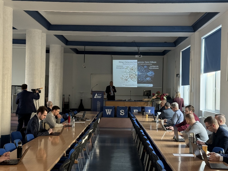 The program began with an introductory lecture by Professor Tomasz Rymarczyk, focusing on the origins and development of artificial intelligence systems. The lecture included a detailed comparison of the biological evolution of the human mind with the engineering design of computational intelligence. The human brain functions as a dynamic system, in which synaptic connections undergo continuous changes through processes of multichemical plasticity without any top-down programming. Artificial intelligence architecture is characterized by an immutable physical structure of connections with modifiable abstract weights. While biology relies on iterative natural selection and environmental pressure testing over millions of years, computer systems utilize deliberate gradient optimization and brute force computation.