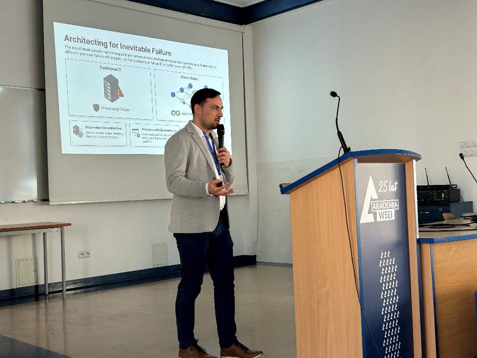 In the second part of the morning session, Dr. Dariusz Wójcik, Eng., delivered a technological lecture. The presentation focused on infrastructure automation and methods for eliminating manual server restarts. Approaches aimed at reducing the burden on IT departments in maintaining the continuity of complex system environments were presented.
